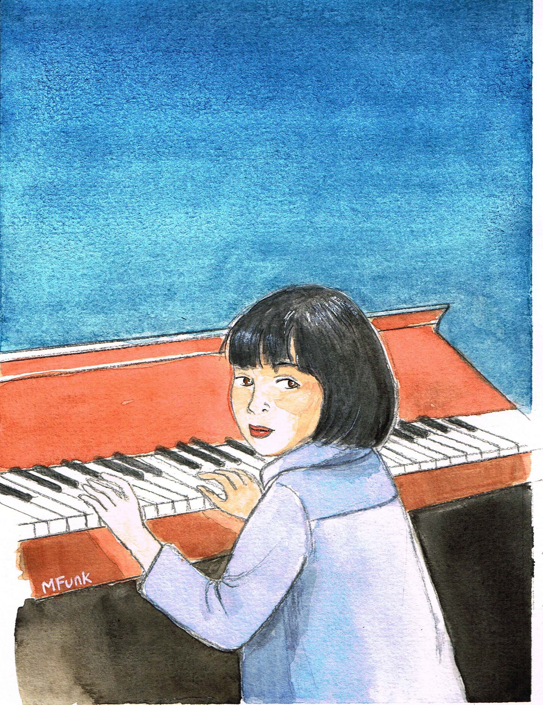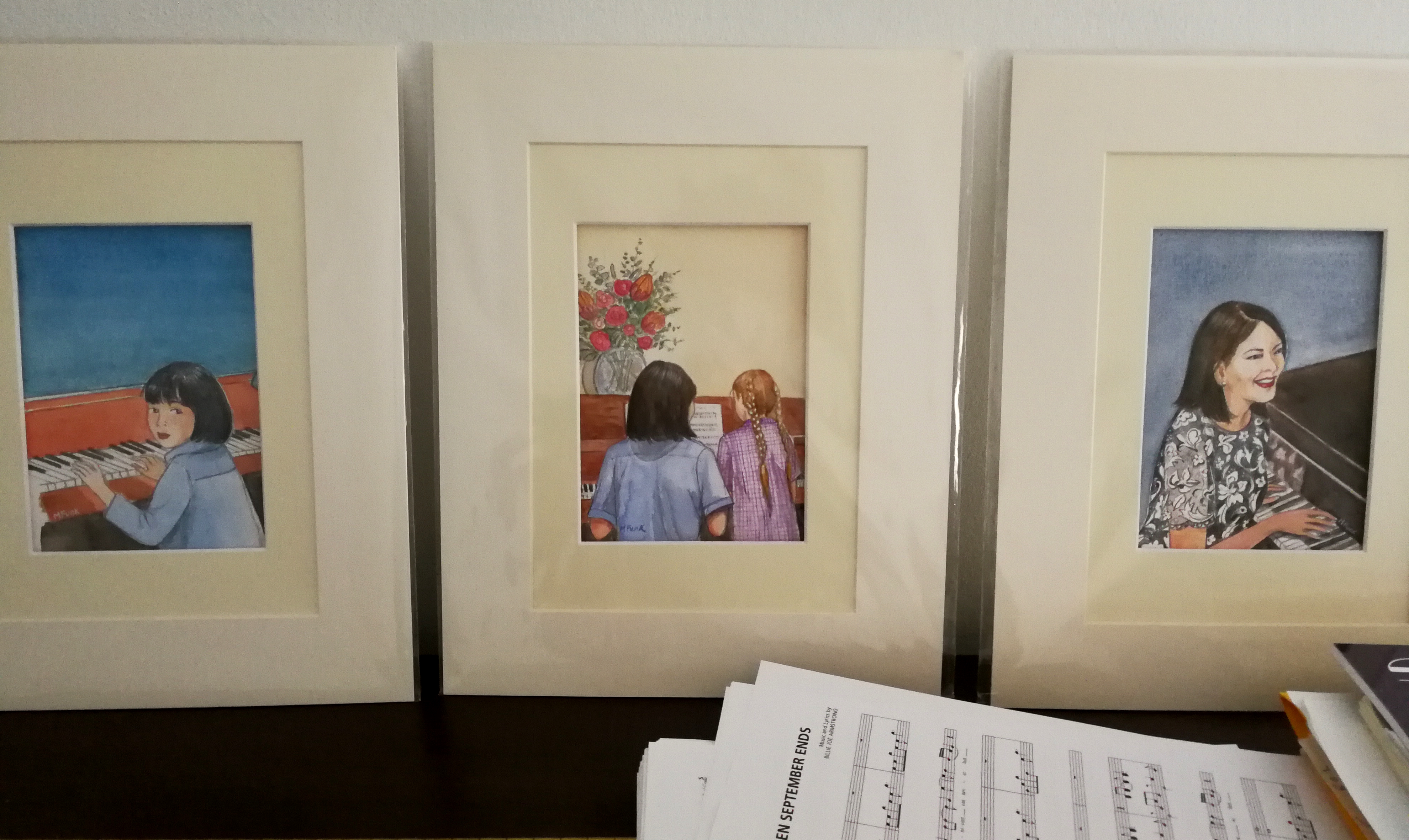 Earlier this year, Mary painted three watercolours for my music room. One is me as a little girl, the second is playing piano in a hotel, and the third is teaching my first student in Australia. They’re still wrapped, propped up on the piano. I need time to think about framing them and where they should go. Mary’s art is in my music room!