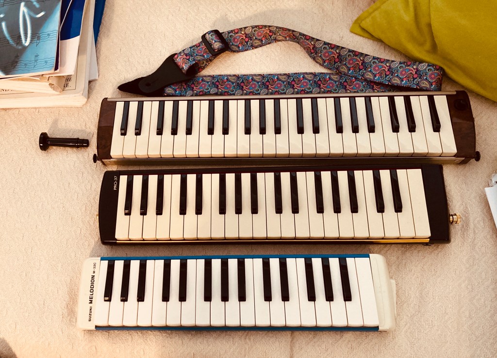 Bottom to top: Suzuki Melodion M-32C, Suzuki Pro-37, Hammond Pro-44H.
