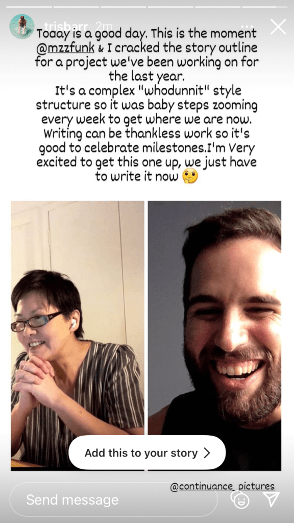 Continuance Pictures founder Tristan Barr says it’s important to remember milestones in our creative journey. He took a screenshot of us in Zoom today after one of our many 3 hour sessions and posted it on Instagram. I have some very driven and creative friends, and am so moved that they invite me into their world.