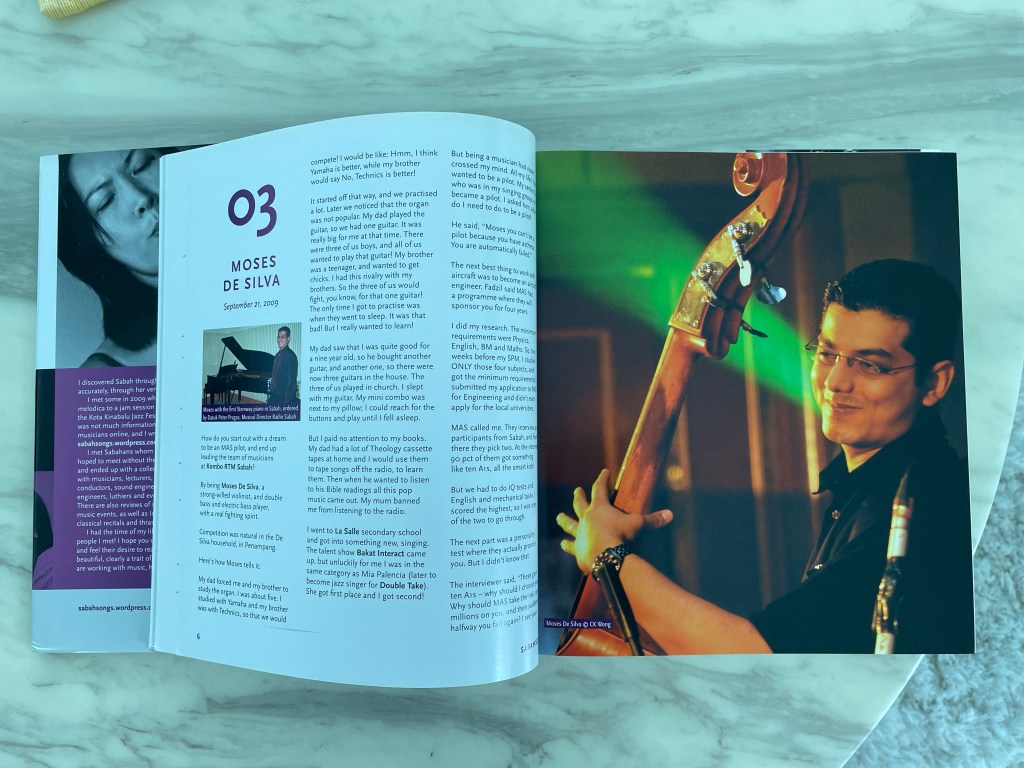 We looked through the book together and found our favourite photo which he took, which was Moses de Silva, bass player. Moses is about to move to Kuala Lumpur to work for RTM the national broadcasting network, on the music side.