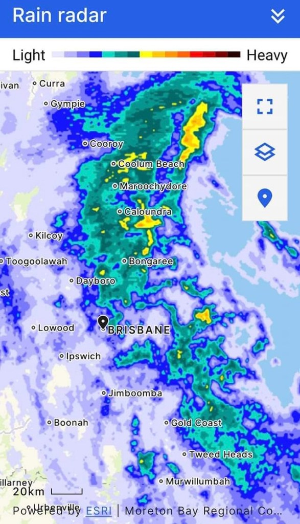 There were plenty of challenges that day. The weather, for one. All the beaches along the Sunshine Coast were closed to the public, and the forecast was for a deluge. We mostly live on the Gold Coast and Brisbane — and me? I’m in the Scenic Rim — that’s a three-hour drive in the rain… Below is a screenshot of the BOM radar. Ho hum.