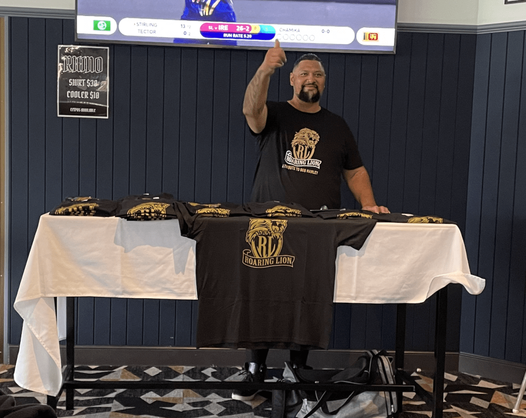 While Toru-Wha were on stage, I sat with Gwyn, wife of rhythm guitarist Wayne Naera. We watched our lead singer Glen selling band merch. Far out — I went to Sabah and look what happened! We have merch! Roaring Lion never stops working.