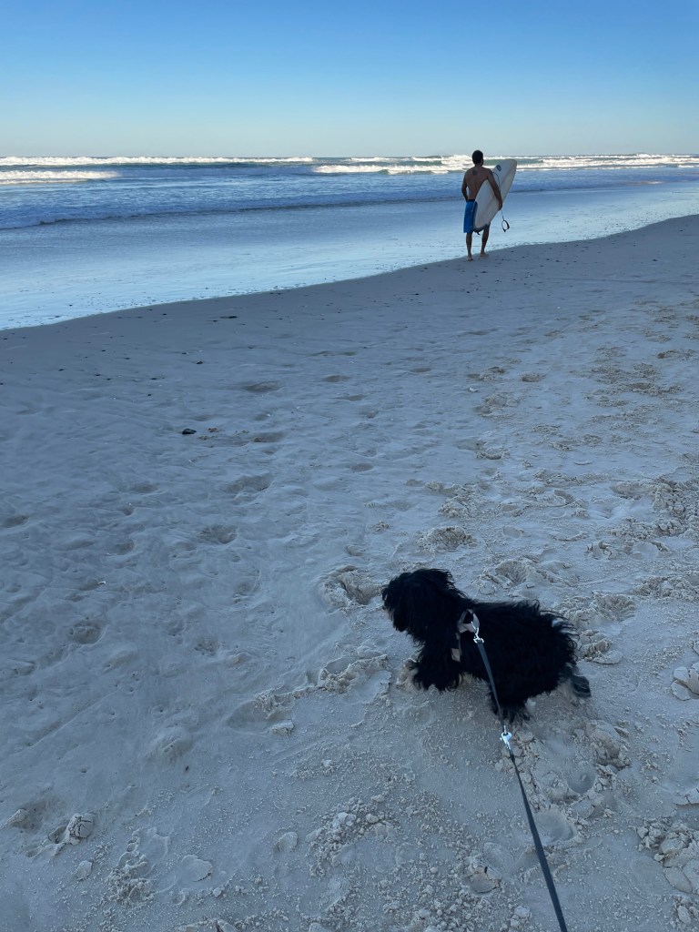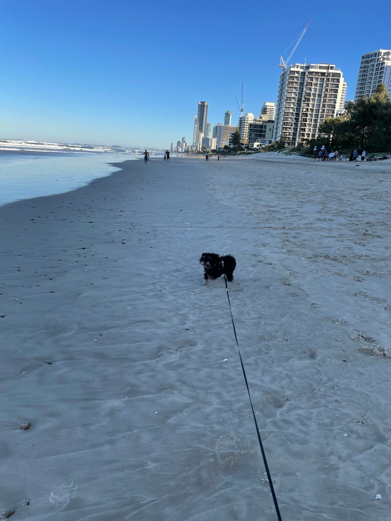 Wookie saw his first surfer. Look at that sand. Coming from England, I cannot believe how even the most insignificant beach in Queensland is more beautiful than anything you could find in England. This was at the end of an afternoon. Just wonderful.