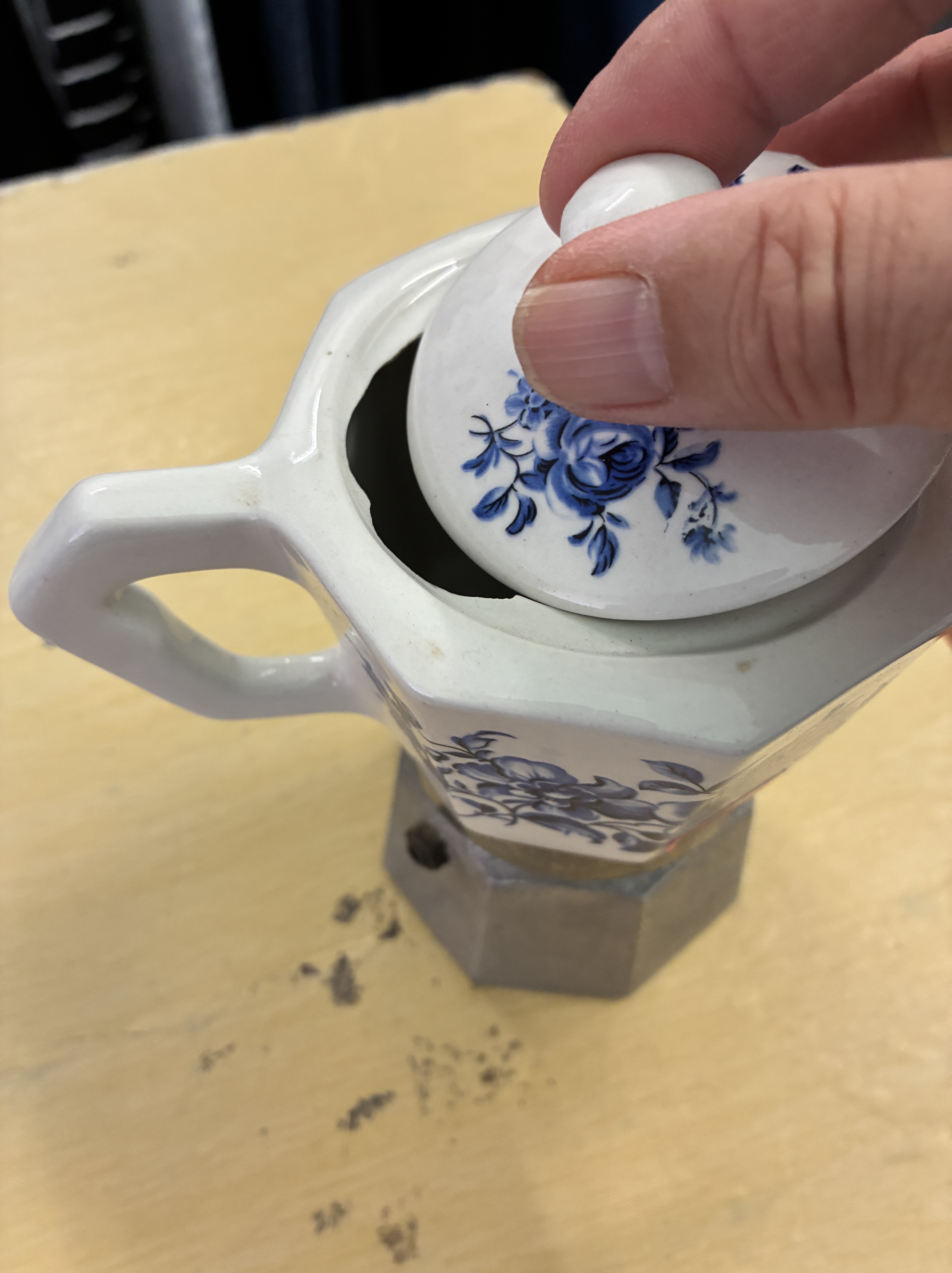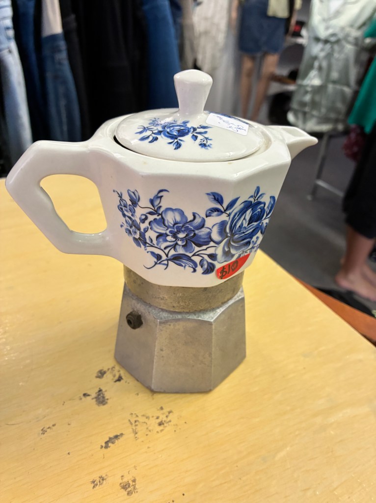 Today, I saw an old, Italian-made ceramic moka pot. I fell in love with it. There was a broken bit on the inside lip, but the lid still covered it, and it is definitely useable. Anyway, even if no-one uses it, who cares? It’s gorgeous!