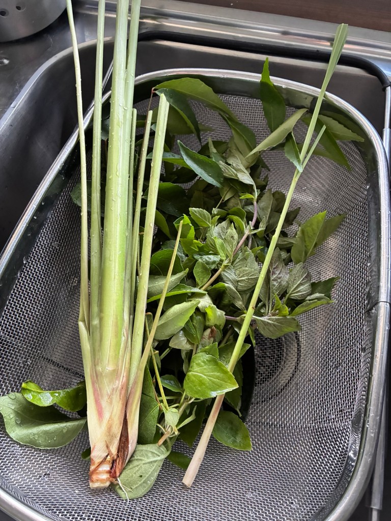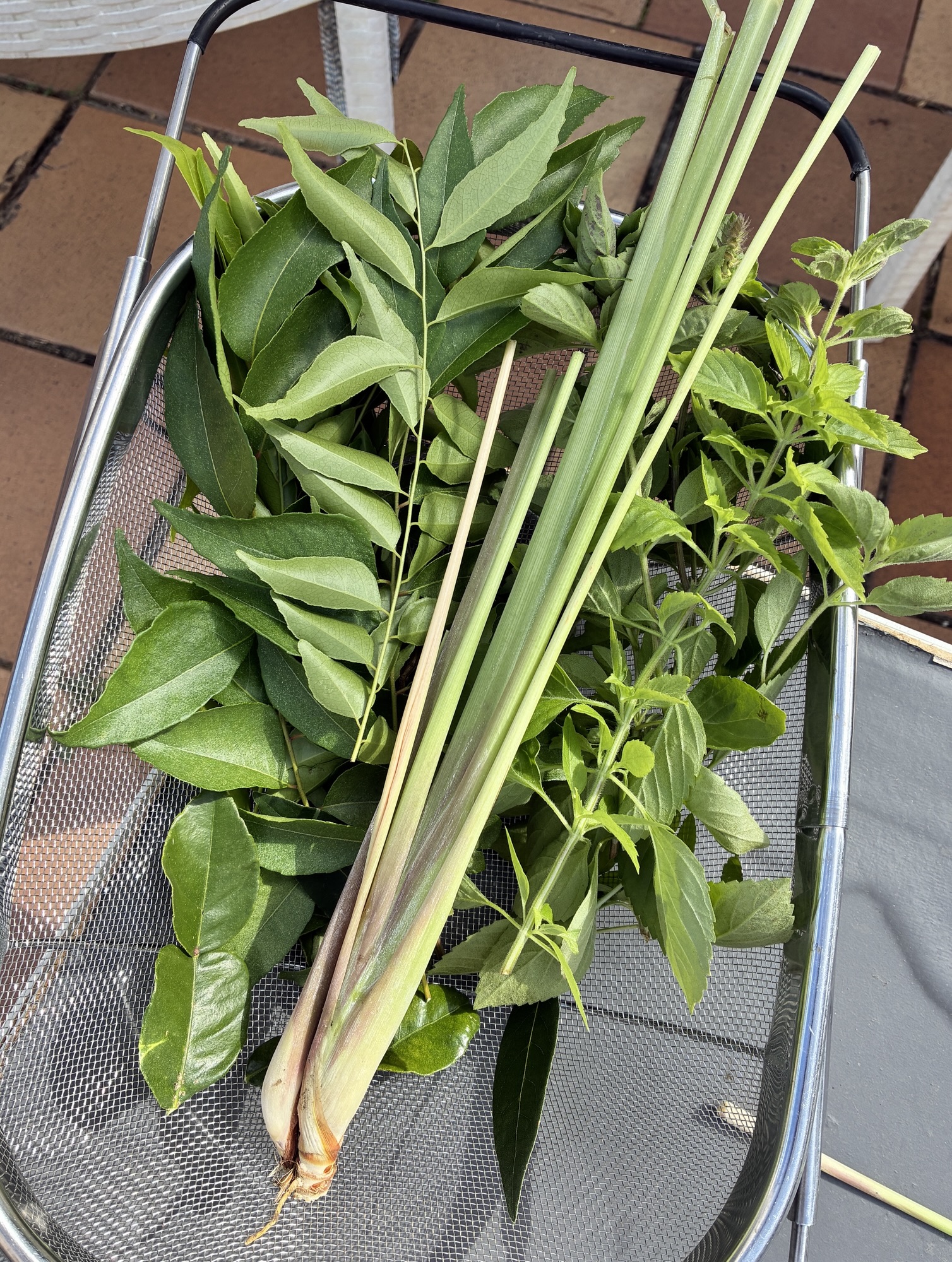 The typical ones are here, lemon grass, kaffir lime leaves, curry leaves, Thai basil and bay leaf.